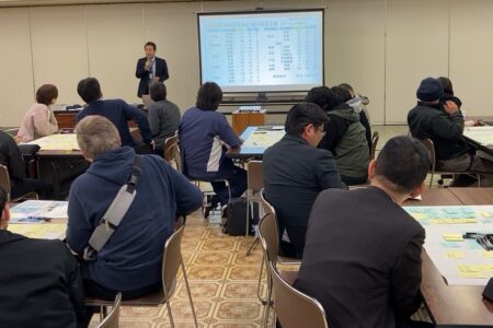 続いて、高岡市危機管理課の室谷課長から、「小学校区別の防災の現状」と題して、校区別の避難所の数、防災士の数についての説明と、30~40代の防災士の割合が少ない状況の説明があり、子育て世代の皆さんにもぜひ防災士の資格を取ってほしいとの呼びかけがありました。