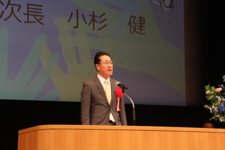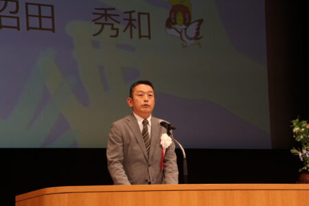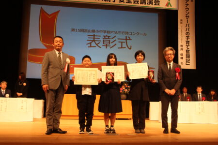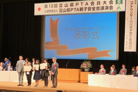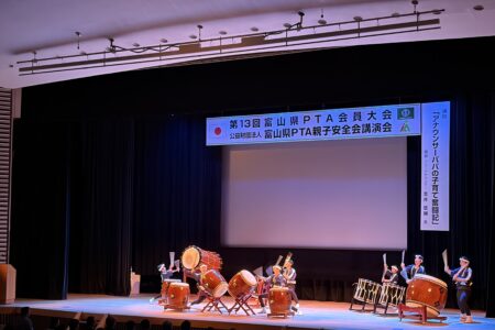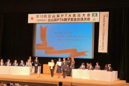 オープニングアトラクション「越中いさみ太鼓」(越中いさみ太鼓保存会since1952:砺波市)に続いて、「KIZUNA ~知ろう 感じよう とやまのチカラ~ 」をメインテーマに、第13回富山県PTA会員大会の開会式を行いました。開会式は、柳澤副会長(会員大会実行委員会担当)の開会宣言で始まり、その後、国歌斉唱、沼田県PTA連合会会長のあいさつに続き、廣島富山県教育委員会教育長代理の小杉教育次長様よりご祝辞をいただきました。続いて、富山県PTA連合会主催、富山県教育委員会後援、北日本新聞社協賛として作品募集をした第15回三行詩コンクールの表彰式を行いました。表彰式には、「小学生の部」、「中学生の部」、「一般の部」の三部門において最優秀賞を受賞された皆さんにご出席いただきました。3名の皆さん、最優秀賞おめでとうございます。なお、他の入賞者については、この後、賞状及び記念品等を送らせていただきます。