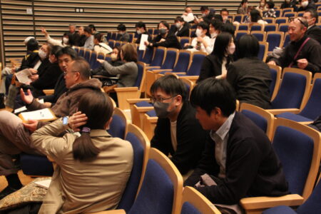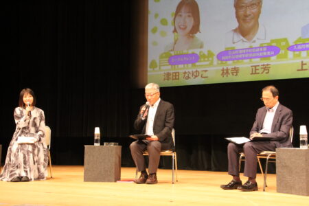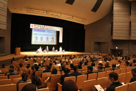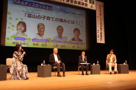 パネルディスカッションでは、「とやまのチカラ ~これからのPTAと地域のつながり~」をテーマとして、ローカルタレント 津田なゆこ氏が進行役を担い、入善町教育センター教育専門指導員 上野郁行氏、立山町地域学校協働本部代表 林寺正芳氏、富山市立堀川小学校有成会長 源 和之氏をパネリストに、3つのテーマ「①富山の子育ての強みとは?」~地域学校や教育に協力的、自然豊か、教育熱心・・・、「②子どもにとって良い地域とは?」~子どもと地域が関わる機会が多い地域(自分も役立っていると感じられる場がある)、子どもがやりたいことができる地域・・・、「③地域とともに育つ学校づくりとは?」~コミュニティースクールは学校が地域と一緒に子どもを育てる仕組み、学校運営にPTAが関わることで直接子どもの学びにもつながる・・・などについて話合いを行いました。まとめとして、会場の皆さんにもご参加いただき「地域とともに育つ学校づくり」をテーマに学校・地域、PTAが一緒にできることを話し合い、終了しました。最後に、「アナウンサーパパの子育て奮闘記」と題して、フリーアナウンサー 笠井信輔氏による講演会(公財富山県PTA親子安全会 主催)があり、閉会しました。