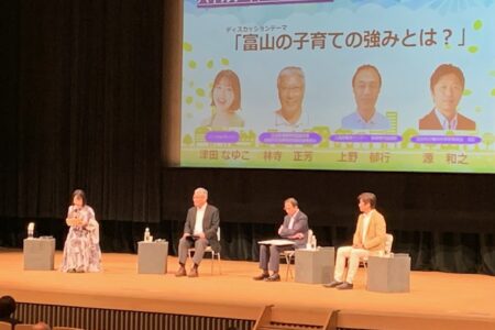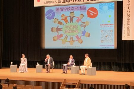パネルディスカッションでは、「とやまのチカラ ~これからのPTAと地域のつながり~」をテーマとして、ローカルタレント 津田なゆこ氏が進行役を担い、入善町教育センター教育専門指導員 上野郁行氏、立山町地域学校協働本部代表 林寺正芳氏、富山市立堀川小学校有成会長 源 和之氏をパネリストに、3つのテーマ「①富山の子育ての強みとは?」~地域学校や教育に協力的、自然豊か、教育熱心・・・、「②子どもにとって良い地域とは?」~子どもと地域が関わる機会が多い地域(自分も役立っていると感じられる場がある)、子どもがやりたいことができる地域・・・、「③地域とともに育つ学校づくりとは?」~コミュニティースクールは学校が地域と一緒に子どもを育てる仕組み、学校運営にPTAが関わることで直接子どもの学びにもつながる・・・などについて話合いを行いました。まとめとして、会場に参加の皆さんにもご参加いただき「地域とともに育つ学校づくり」をテーマに学校・地域、PTAが一緒にできることを話し合い、終了しました。最後に、「アナウンサーパパの子育て奮闘記」と題して、フリーアナウンサー 笠井信輔氏による講演会(公財富山県PTA親子安全会 主催)があり、閉会しました。