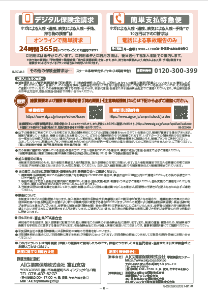 小・中学生総合保障制度は、富山県PTA連合会が団体契約者となっているもので、令和8年度版の団体割引率が30%となっており割安に加入することができるものです。詳細については、以下、各種「関連ファイル」を閲覧してご一読ください。